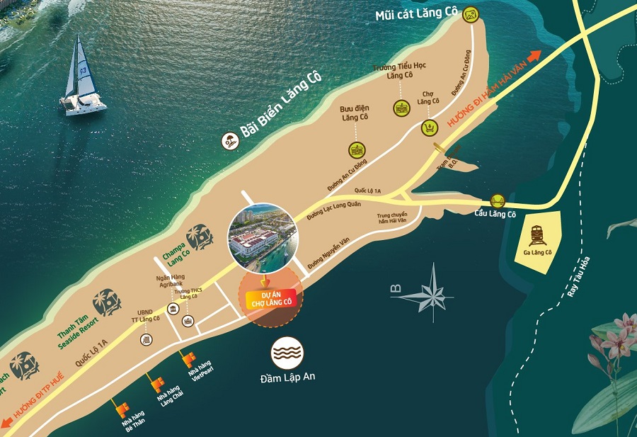 Dự án chợ Lăng Cô có vị trí và điều kiện thuận lợi về giao thông, nằm liền kề tuyến Quốc lộ 1A, tuyến đường Nguyễn Văn, đầm Lập An.